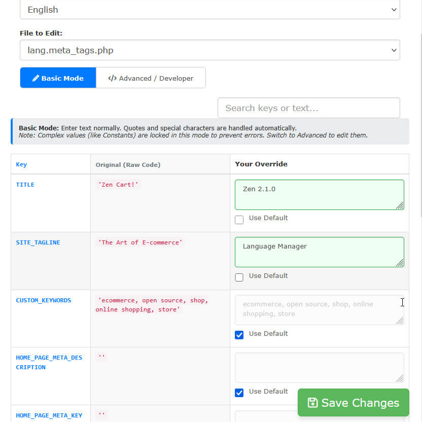 - Advanced Mode: Full raw PHP editing for developers who need to use constants (e.g., 'Text ' . STORE_NAME).